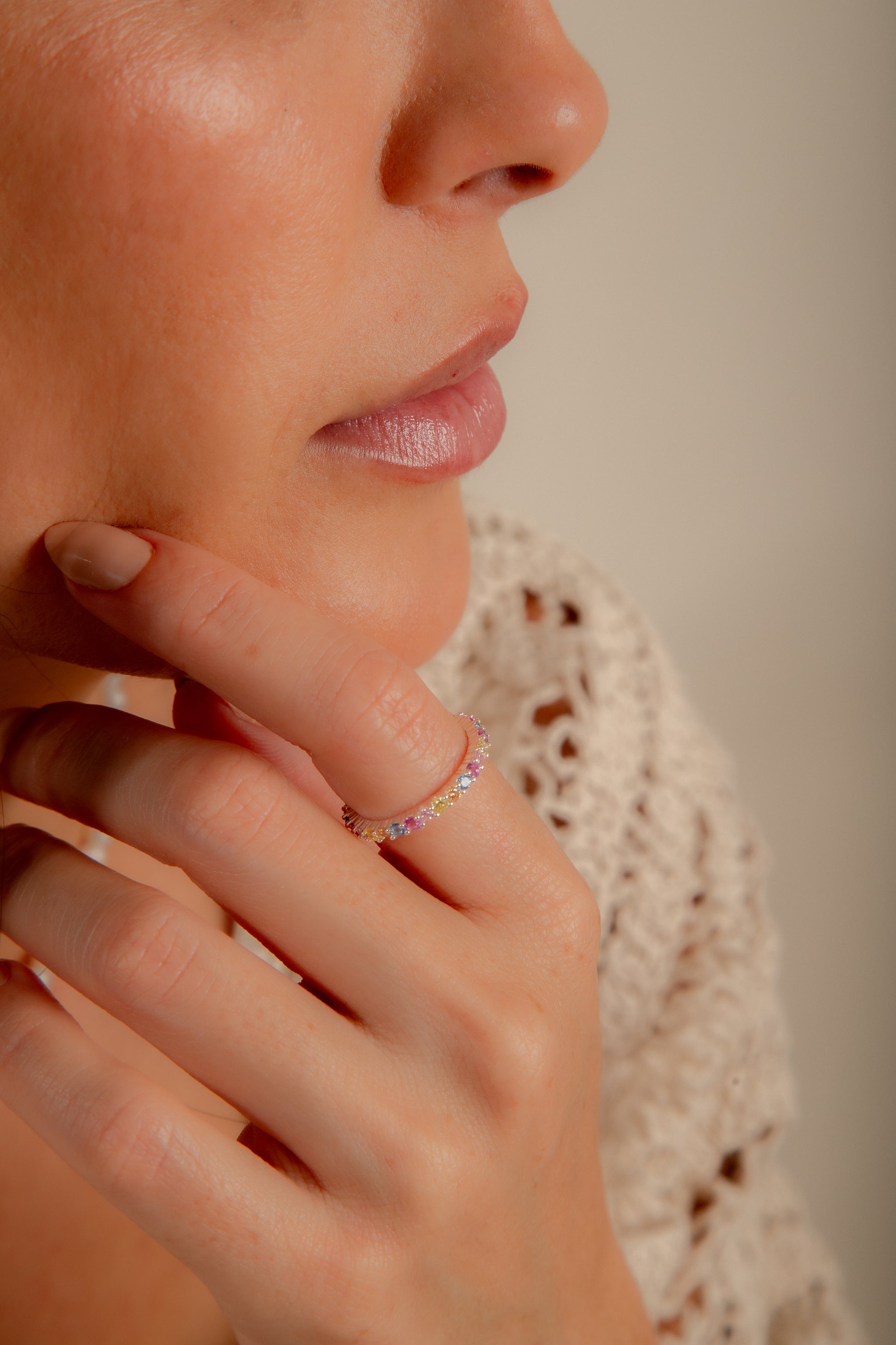 O Anel Rainbow em Prata 925 é uma celebração vibrante da alegria e da individualidade. Banhado em Ródio Branco para um brilho cristalino e duradouro, este anel é adornado com uma tapeçaria de pedras coloridas, evocando o esplendor de um arco-íris capturado em metal nobre. É uma peça que carrega uma mensagem de positividade e otimismo, projetada para ser um ponto de cor expressivo em qualquer momento, afirmando seu estilo com audácia e elegância.