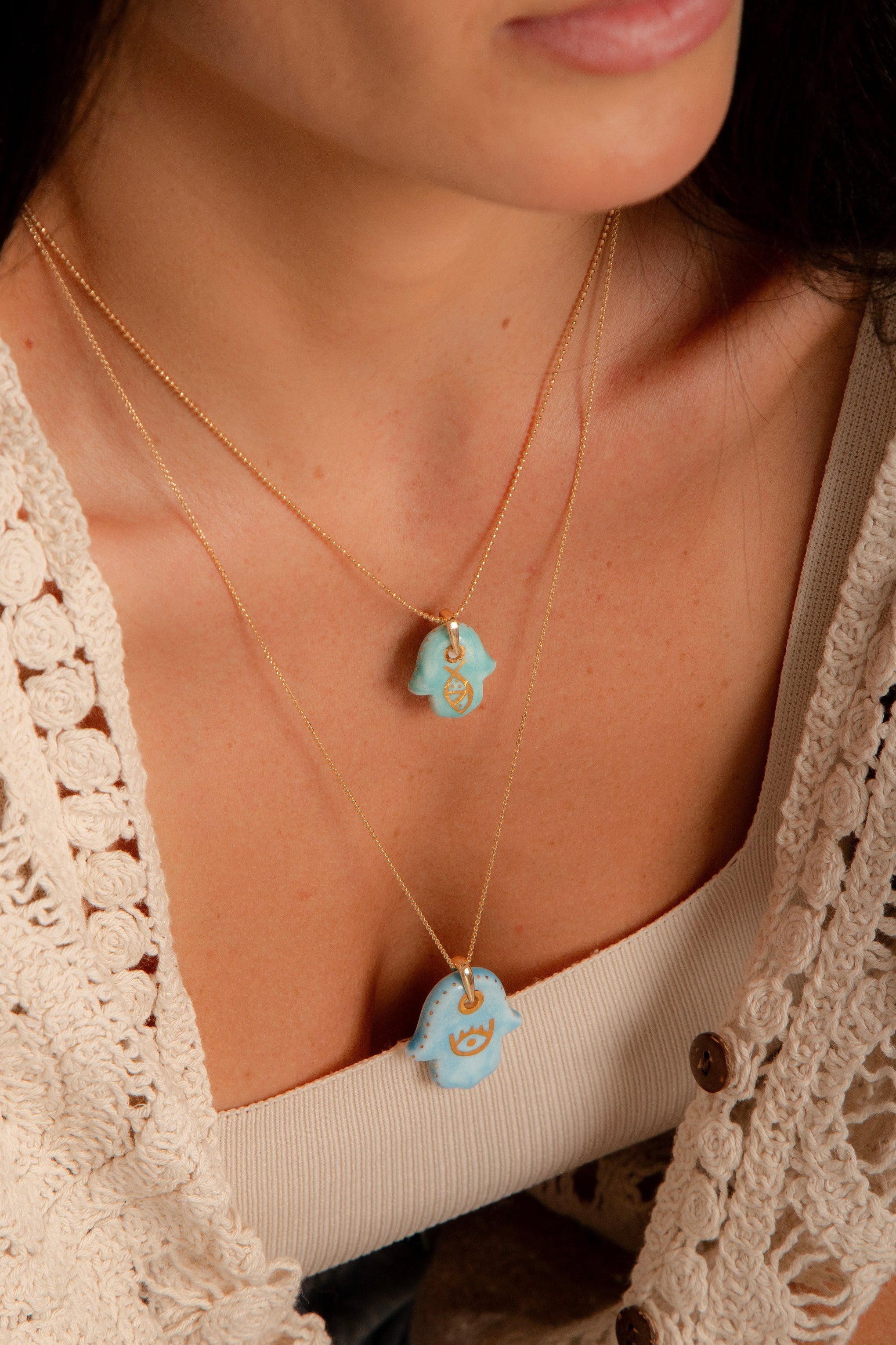 O Colar Palma de Hamsa Porcelana Azul Claro é uma joia que carrega em si um poderoso símbolo de proteção aliado à delicadeza da arte. Com um pingente em porcelana azul vibrante que representa a palma de Hamsa — um amuleto ancestral contra energias negativas — essa peça traduz espiritualidade e elegância em cada detalhe. O banho em ouro 18K sobre a prata 925 confere um brilho sofisticado, enquanto o tom profundo da porcelana evoca serenidade e mistério. Um colar que transcende o acessório e se torna talismã pessoal, ideal para quem busca beleza com significado.