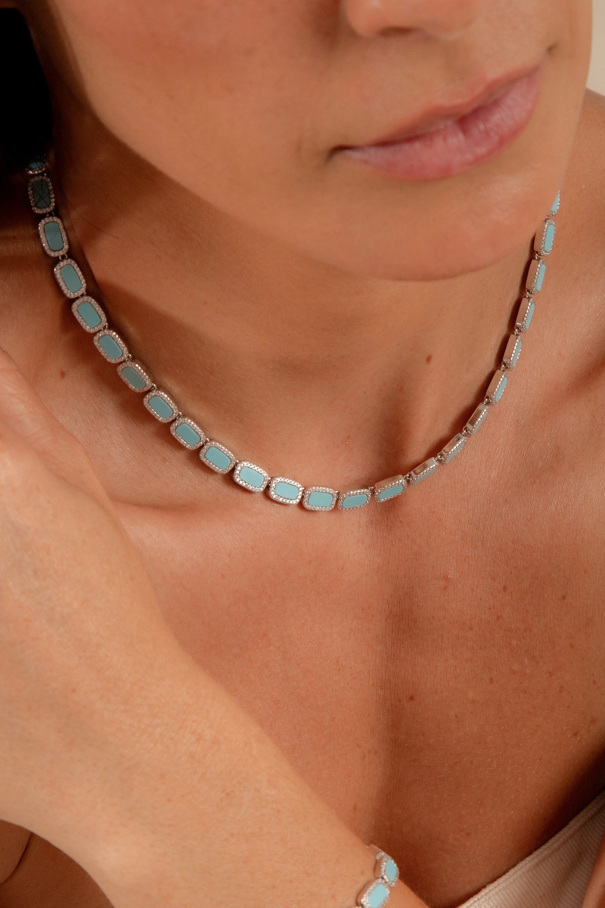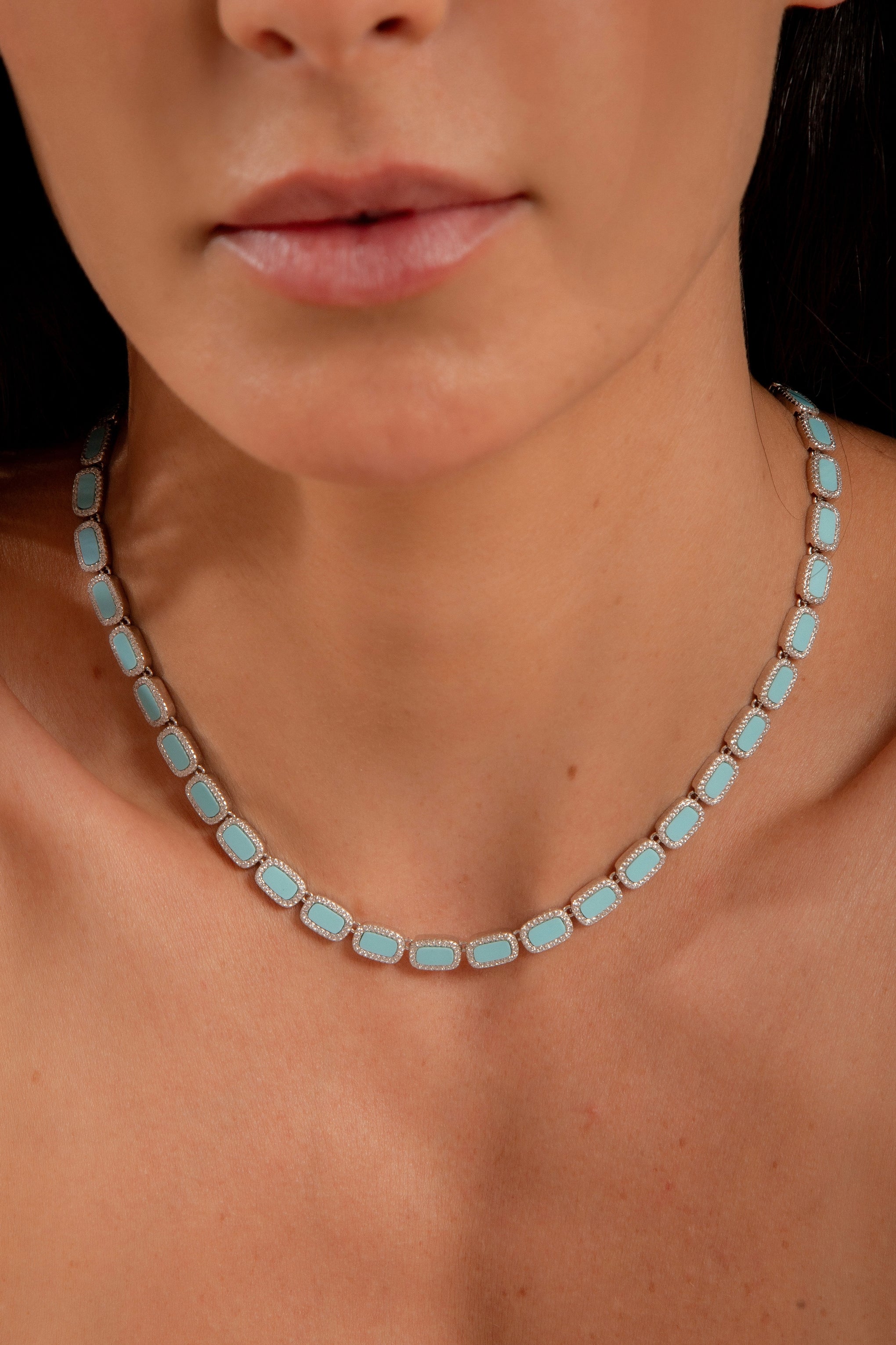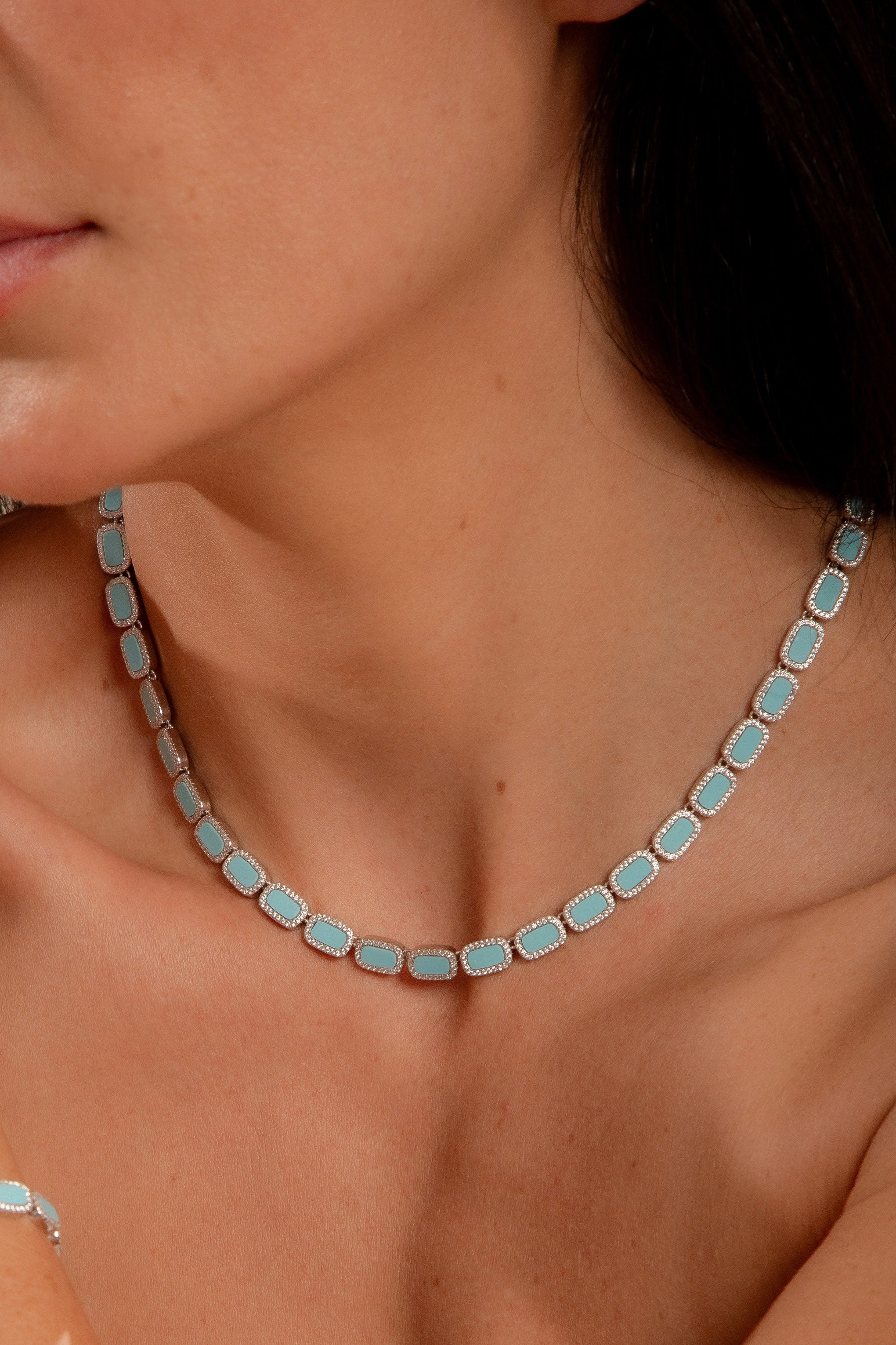 Este Colar Riviera captura a essência do verão e a sofisticação atemporal. Em vez do brilho clássico, esta peça ousa com a cor serena e vibrante da turquesa, onde cada pedra é perfeitamente "abraçada" por uma cravação que realça sua beleza. Com 42 cm, ele repousa elegantemente sobre o colo, oferecendo um toque de cor refinado que remete ao mar e ao céu. O acabamento em banho de ródio branco sobre a Prata 925 não só protege a joia, mas confere um brilho luxuoso, tornando este colar um símbolo de elegância fresca, proteção e estilo distinto.