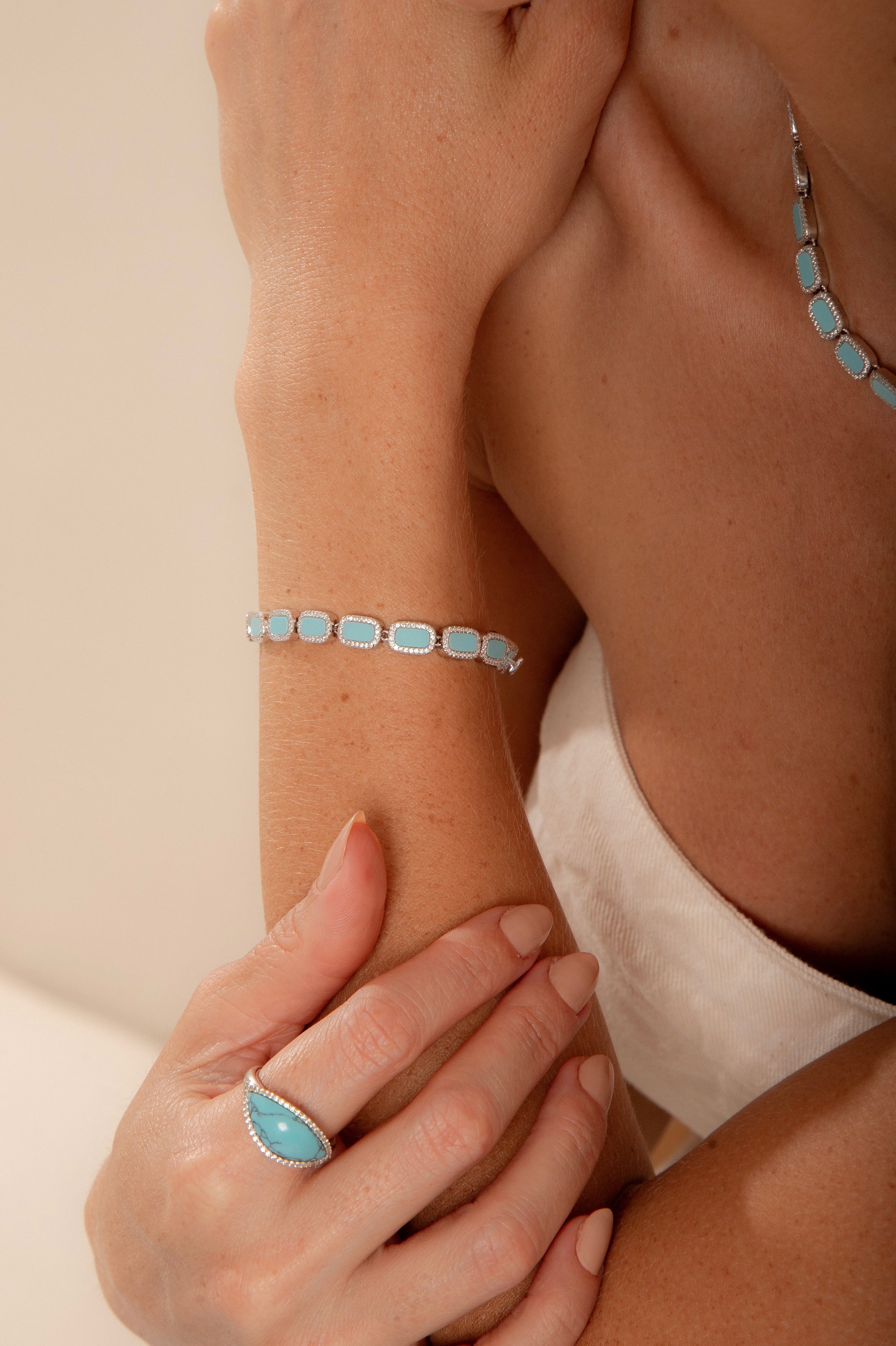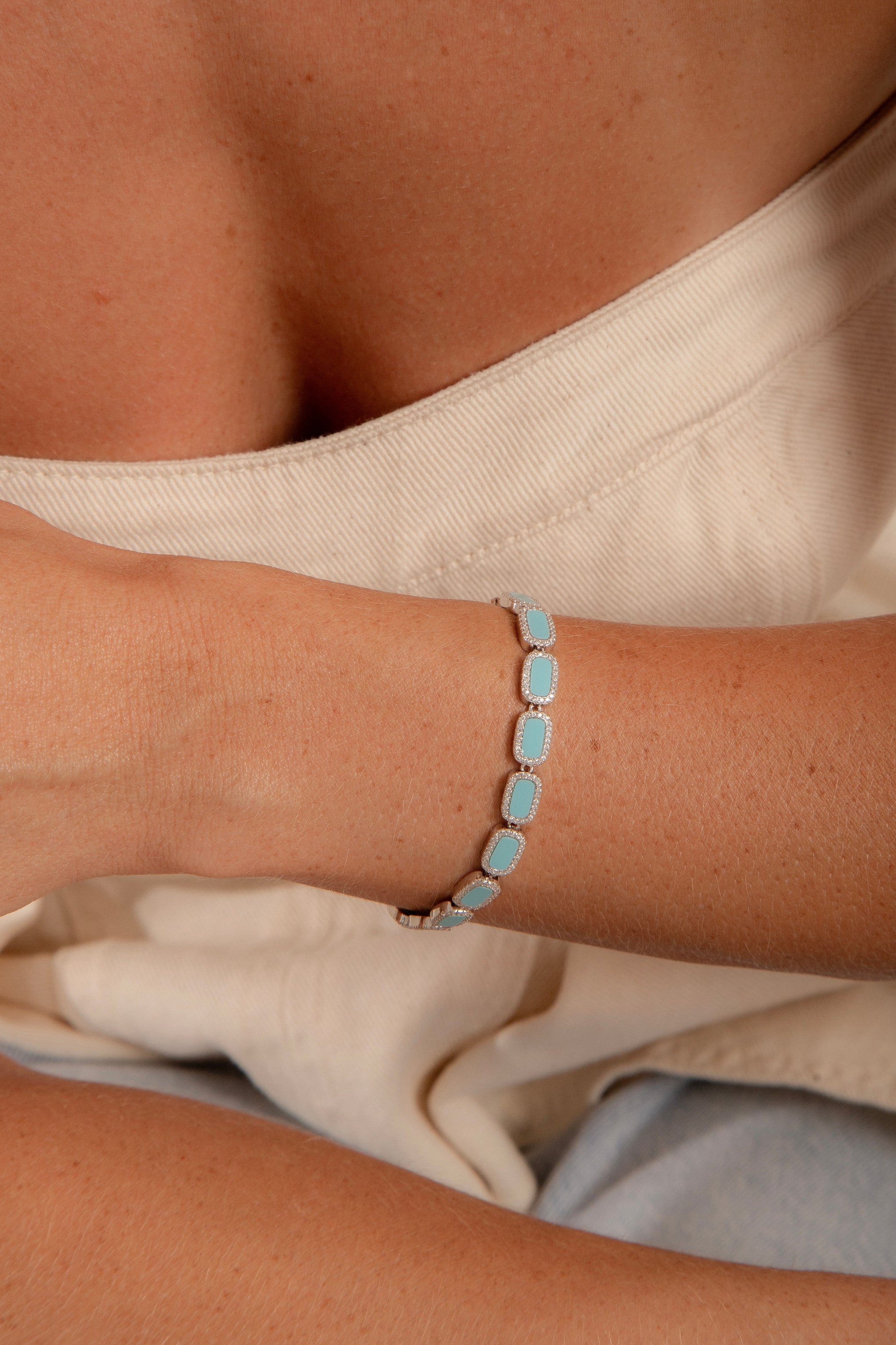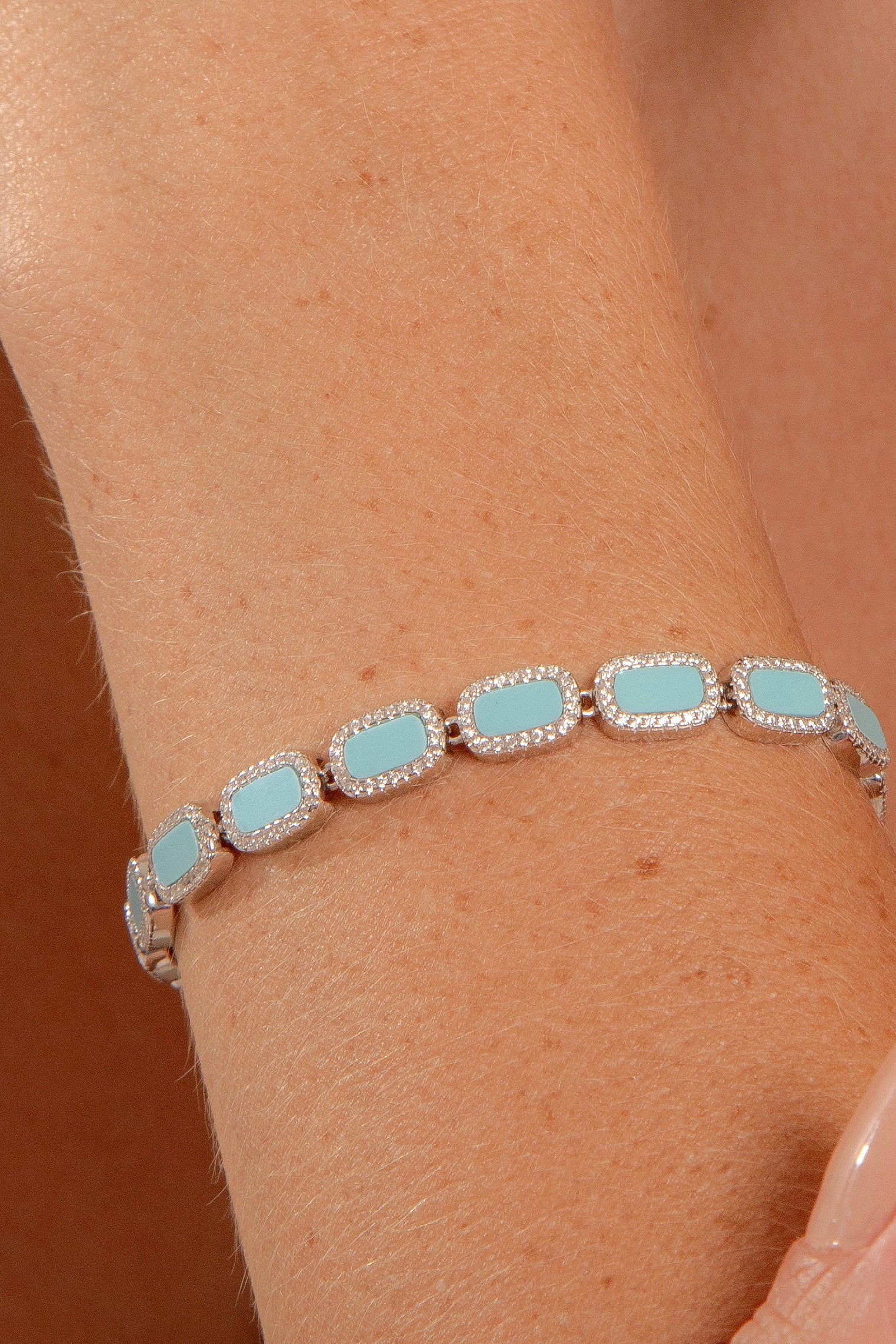Esta Pulseira Riviera é um toque de cor serena e sofisticação que envolve o pulso. Capturando a essência vibrante da turquesa, cada pedra é individualmente abraçada por uma moderna cravação "ao redor", criando um fluxo contínuo de elegância. Com 17 cm, ela ajusta-se delicadamente, servindo como um amuleto de cor e estilo. O luxuoso banho de ródio branco sobre a Prata 925 eleva a peça, garantindo um brilho duradouro que ilumina qualquer gesto, simbolizando proteção, calma e uma feminilidade cheia de vida.