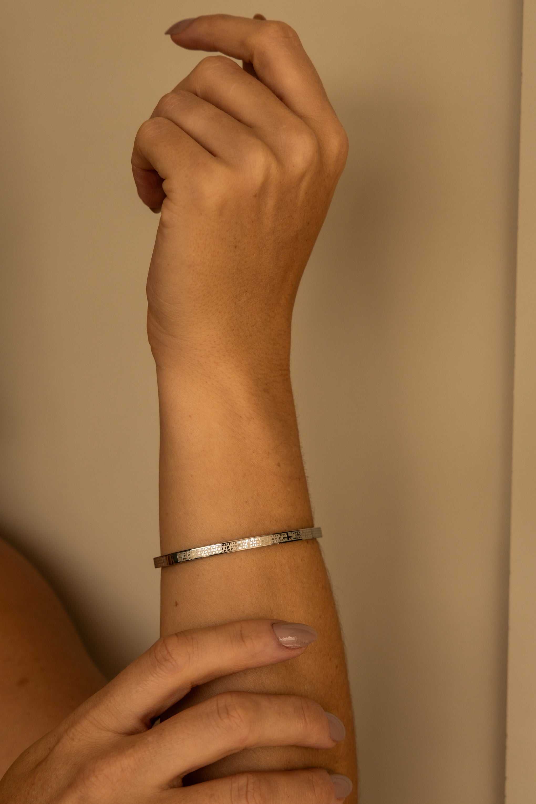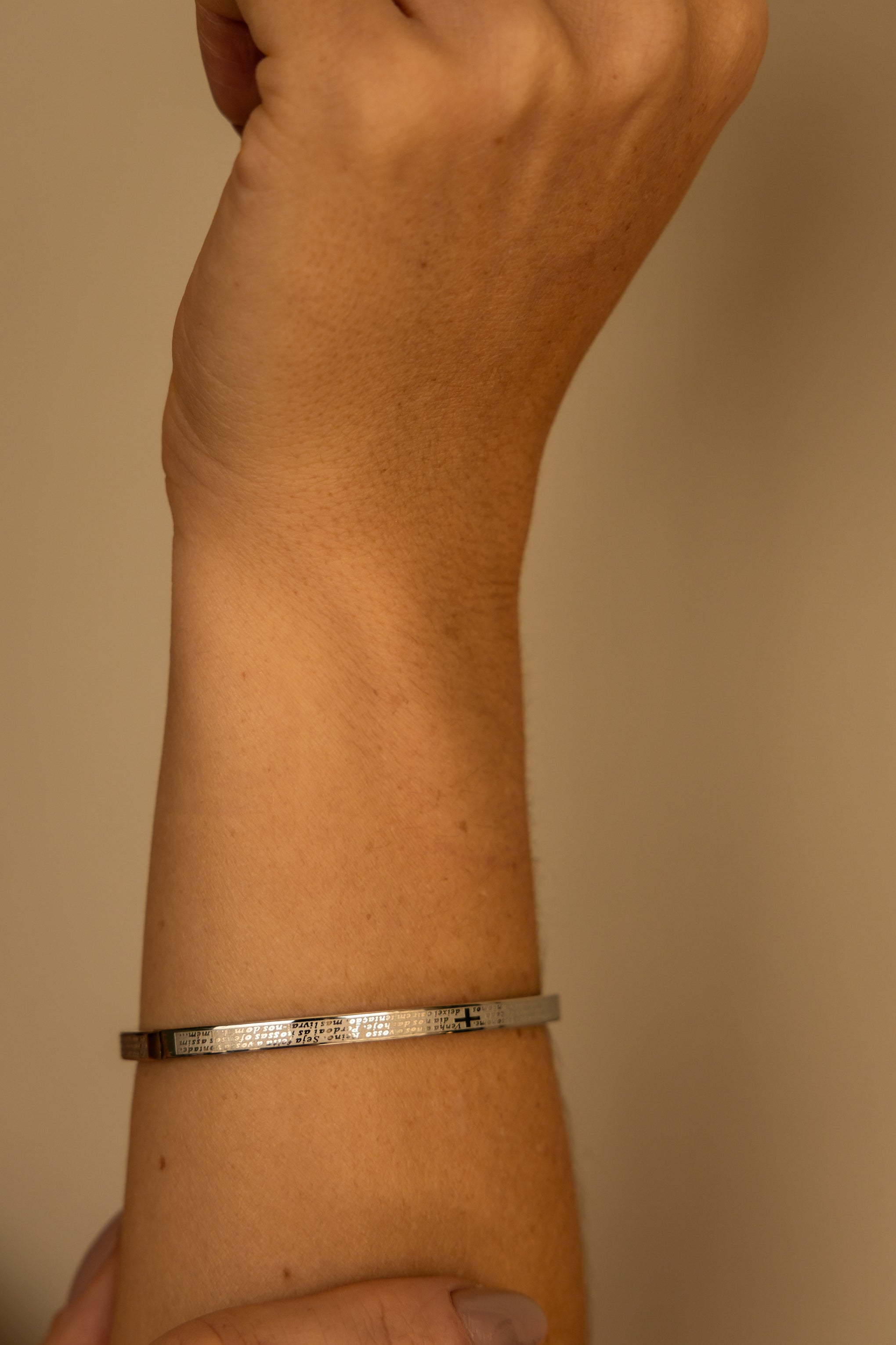 O Bracelete Pai Nosso banhado em ródio branco é a união perfeita entre espiritualidade e elegância contemporânea. Seu acabamento prateado confere um brilho sofisticado e discreto, enquanto a oração do Pai Nosso, gravada com precisão e delicadeza, transforma esta joia em um amuleto de fé e proteção. Ideal para quem valoriza peças que transmitem significado profundo sem abrir mão do estilo refinado.